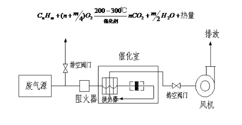 催化燃烧法属于热力破坏法。其机理是氧化和热裂解、热分解废气中的有机成分,使其转化成无毒的CO2和H2O。催化燃烧技术为污染物的治理提供了独特的经济解决办法,有机废气采用催化燃烧处理具有净化效率高、能耗低、无二次污染等优点。催化燃烧的净化效率一般都在95%以上,是高浓度、小流量有机废气净化的技术。